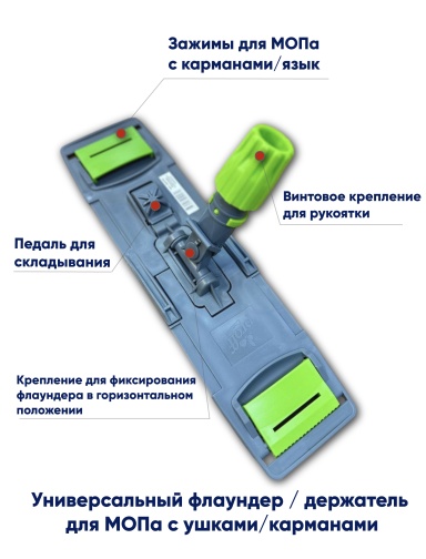 - Фиксация положения флаундера: Возможность использования как для вертикального, так и для горизонтального отжима позволяет адаптировать держатель под разные условия уборки.