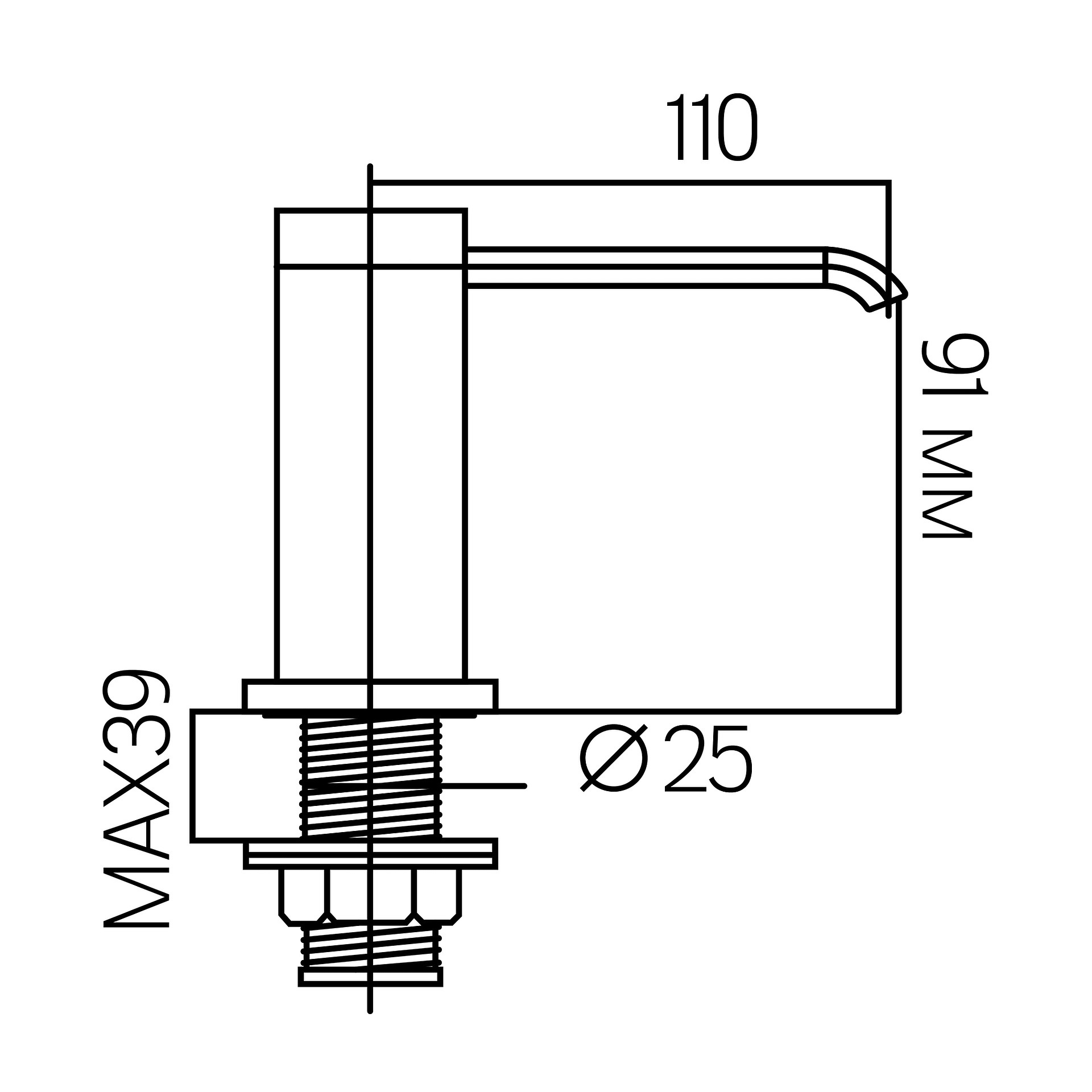 - Размеры: диаметр дозатора: 25 мм, монтажный диаметр: 25 мм, высота: 91 мм.