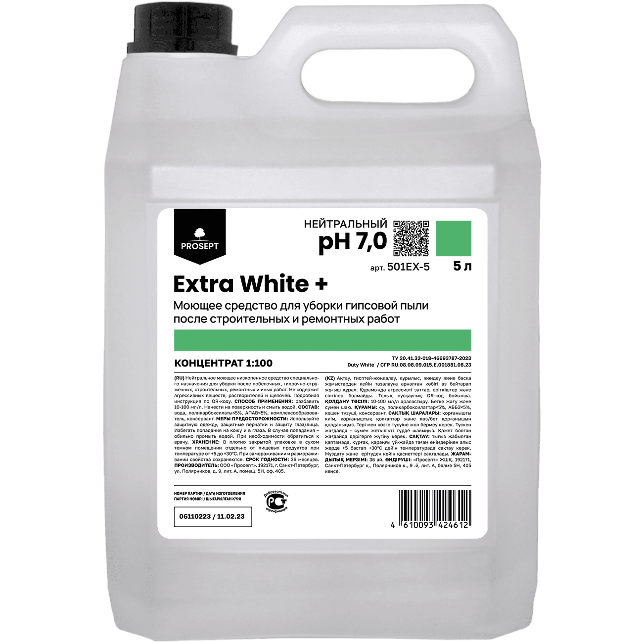Extra White+ 5 литров — нейтральный концентрат, предназначенный для борьбы с гипсовой пылью и удаления известковых и гипсовых отделочных растворов. Он связывает микрочастицы пыли и соли жесткости, предотвращая их оседание на поверхностях.