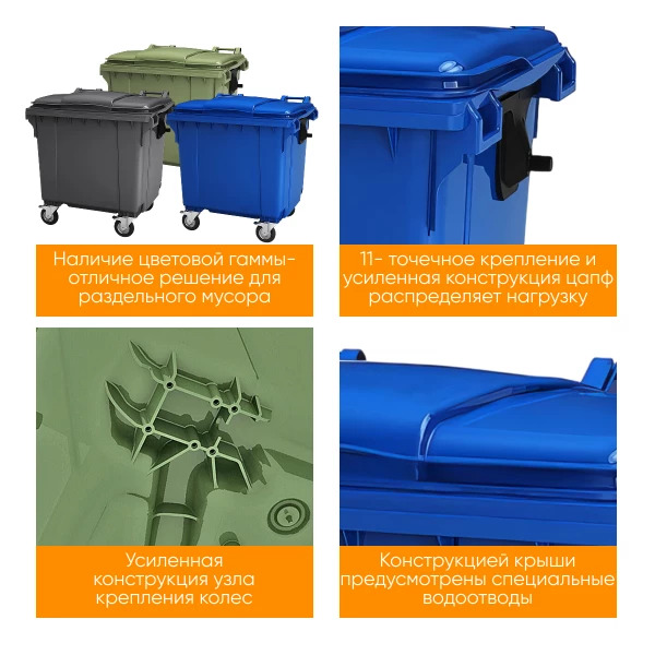 - Удобство использования: Цельнолитые ручки по краям контейнера и усиленное место захвата гребенкой облегчают его перемещение и разгрузку. Усиленный узел крепления колес гарантирует надежность конструкции при транспортировке.