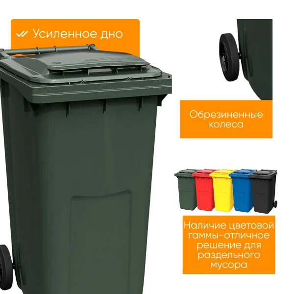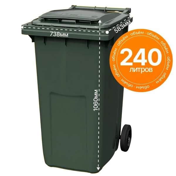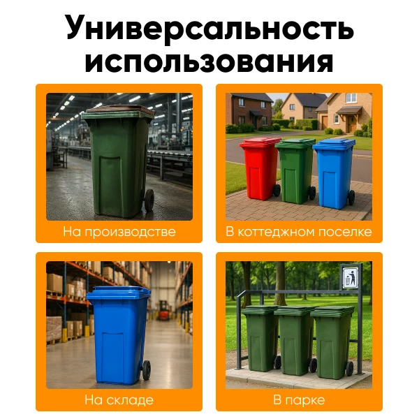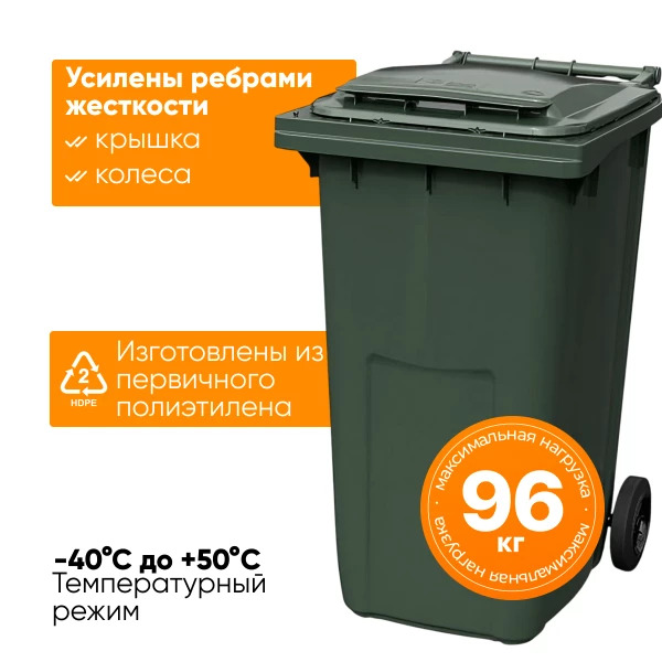 Мусорный контейнер зелёный объемом 240 литров с крышкой и колесами — это универсальное и практичное решение для сбора бытовых и пищевых отходов. Он идеально подходит для использования в частных домах, коттеджных поселках, магазинах, на складах и предприятиях различного профиля.