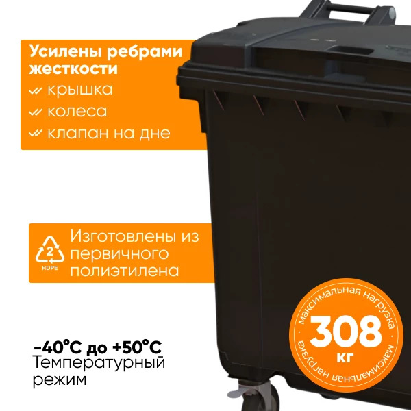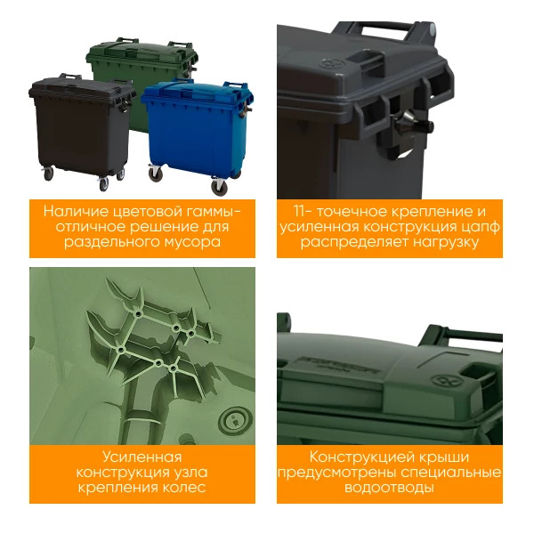 - Удобство использования: Цельнолитые ручки по краям контейнера и усиленное место захвата гребенкой облегчают его перемещение и разгрузку. Усиленный узел крепления колес гарантирует надежность конструкции при транспортировке.