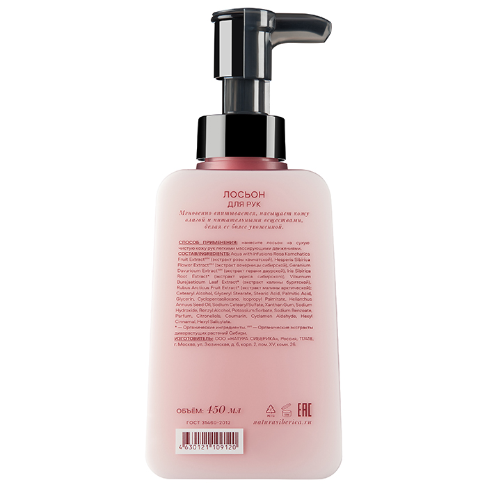 Состав: вода с добавлением экстракта розы камчатской (*WH), экстракт вечерницы сибирской (*WH), экстракт герани даурской (*WH), экстракт ириса сибирского (*), экстракт калины бурятской (*), экстракт малины арктической (*), Cetearyl Alcohol, Glyceryl Stearate, Stearic Acid, Palmitic Acid, Glycerin, Cyclopentasiloxane, Isopropyl Palmitate, Helianthus Annuus Seed Oil, Sodium Stearyl Sulfate, Xanthan Gum, Sodium Hydroxide, Benzyl Alcohol, Potassium Sorbate, Sodium Benzonate, Parfum, Citronellols, Coumarin, Cyclamen Aldehyde, Hexyl Cinnamal, Hexyl Salicylate.